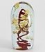 Das Glaskunstwerk ist handgefertigt und besteht aus einer roten Spirale, umgeben von Luftblasen und Blattgoldflocken zur weiteren Dekoration.
