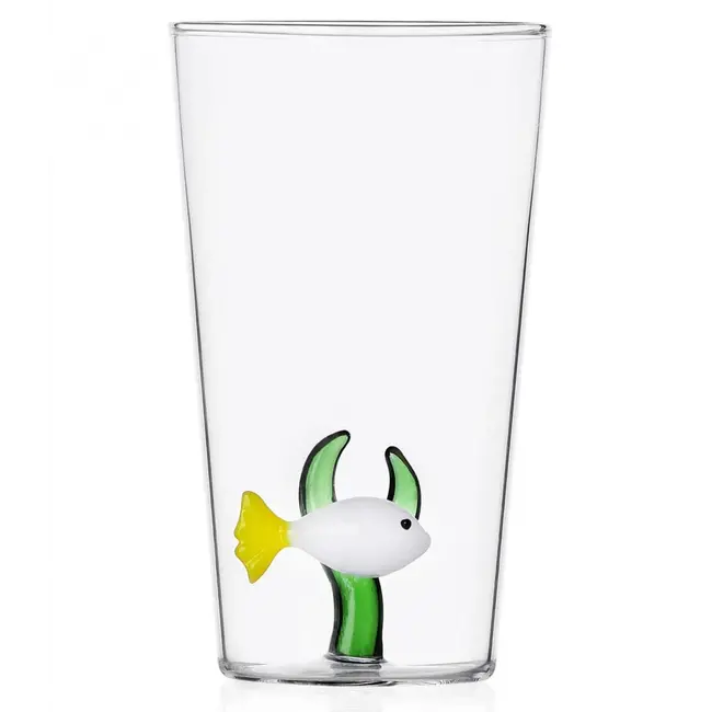 Longdrinkglas mit weißem Fisch aus der Marine Garden Serie von Ichendorf Milano, entworfen von Alessandra Baldereschi. Lesen Sie mehr.