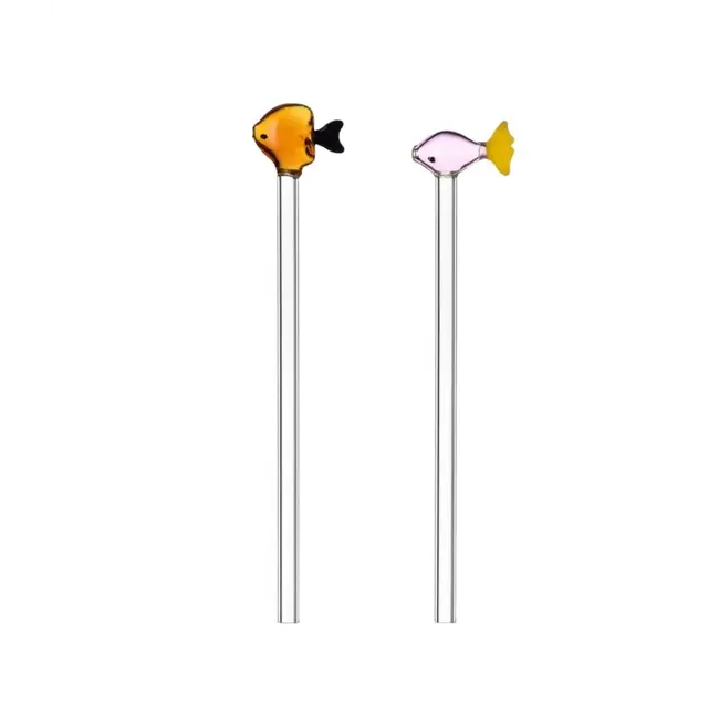 Schöne Glasstrohhalme mit orangefarbenem & rosa Fisch aus der Marine Garden Serie der italienischen Designglasmarke Ichendorf Milano. Die Strohhalme wurden von Alessandra Baldereschi entworfen und aus Borosilikatglas handgefertigt. Diese Glassorte ist sehr leicht, aber gleichzeitig sehr stark & kratzfest.