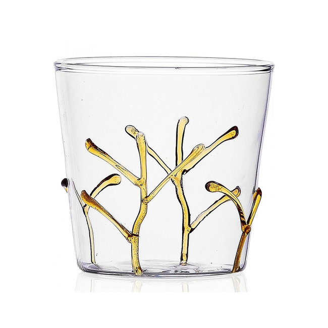 Trinkglas mit bernsteinfarbenen Zweigen aus der Greenwood-Serie von Ichendorf Milano. Lesen Sie mehr.