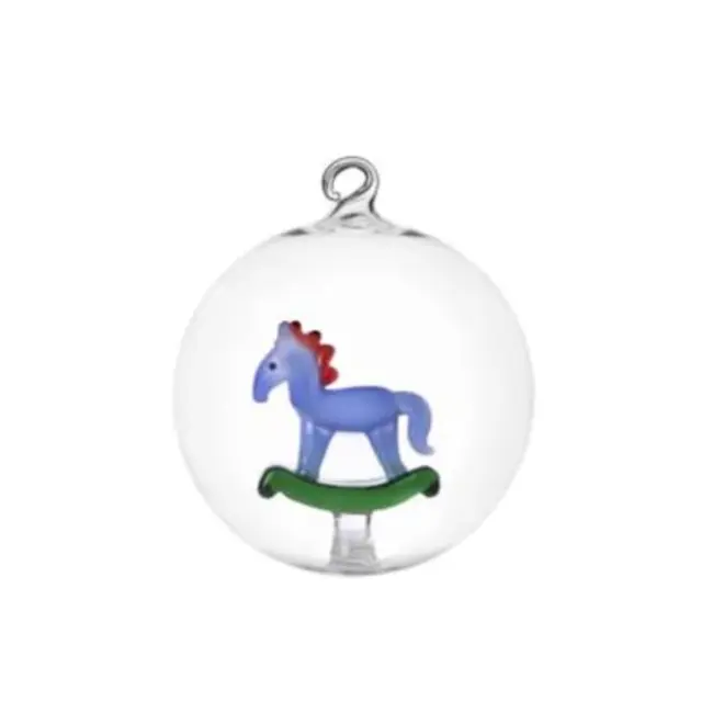 Holen Sie sich die Magie von Weihnachten nach Hause mit der handgefertigten Glas-Weihnachtskugel „Toy Train“ aus der Schiaccianoci-Kollektion von Ichendorf Milano, entworfen von Alessandra Baldereschi. In dieser Weihnachtskugel aus Glas befindet sich ein handgefertigtes Schaukelpferd, das die Magie von Weihnachten zum Leben erweckt!