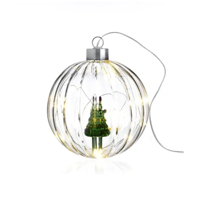 Die bezaubernde Weihnachtskugel-Lampe aus der Woodland-Kollektion – Weihnachten 2025, hergestellt aus handgefertigtem Borosilikatglas, umhüllt einen zarten, in Glas geschnittenen Weihnachtsbaum.