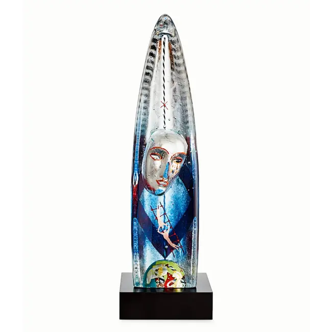 Vertical Journey ist eines der detaillierteren Boote von Bertil Vallien. Gegossen aus klarem Kristallglas mit einem handbemalten Kopf, der über einem Globus schwebt, umgeben von gegossenen Kupferfiguren. Das Objekt wird mit einem schwarzen Holzsockel geliefert.