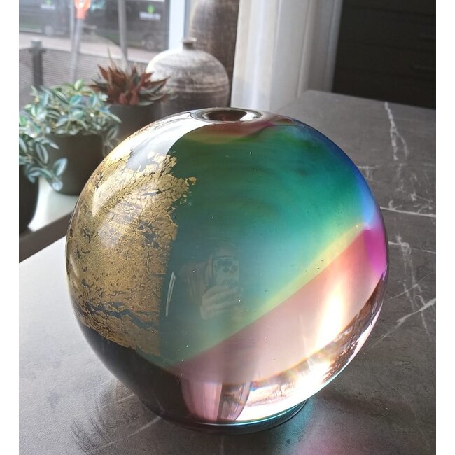 Wunderschöne Leerdam Serica, geblasen vom Meisterglasbläser Marco Lopulalan für Royal Leerdam Crystal. Die schwere Kristallkugel ist mit frischen Regenbogenfarben und echtem Blattgold verziert, was ihr einen besonders exklusiven Look verleiht.