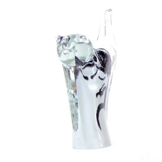 Deze witte handgemaakte kat van glas met zwarte strepen is ± 14 cm hoog.