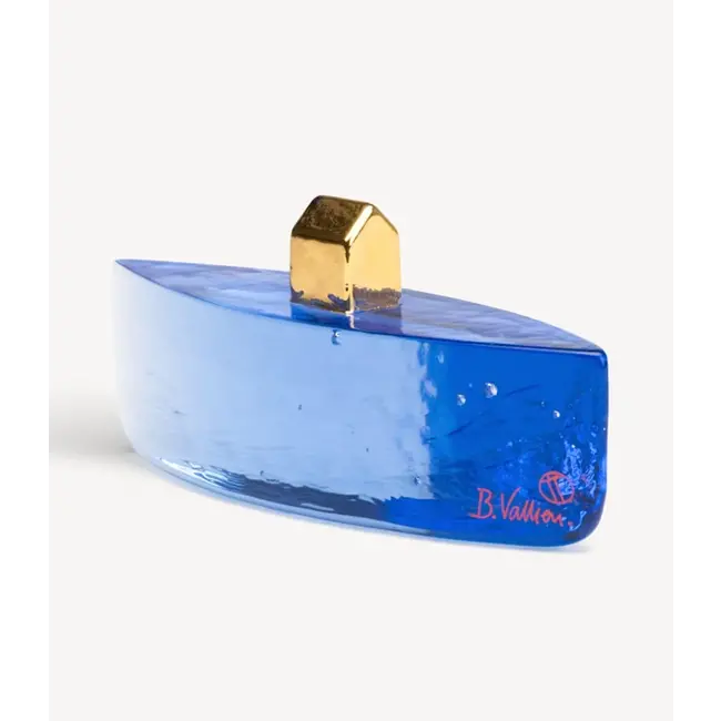 Exclusief kristallen sculptuur "Vessel" uit de Kosta Boda serie Fortress, ontworpen door de wereldberoemde glaskunstenaar Bertil Vallien. Op de bovenzijde van het gesigneerde object is een goudkleurig kristallen huisje aangebracht. Deze glazen boot van Bertil Vallien voor Kosta Boda Zweden is dan ook een uniek verzamelobject en prachtige eyecatcher.