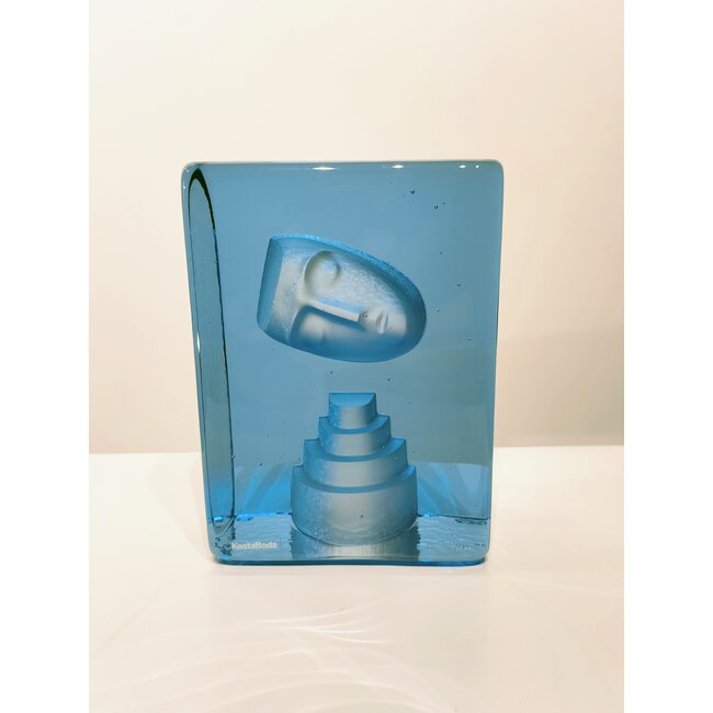 In het diepblauwe kristal staat de afdruk van een gezicht, een terugkerend en iconisch motief van Bertil Vallien dat ook terug te vinden is in zijn beroemde glazen boten.