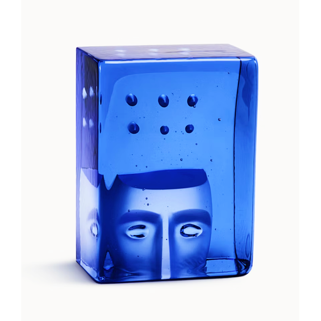 In het diepblauwe kristal staat de afdruk van een gezicht, een terugkerend en iconisch motief van Bertil Vallien dat ook terug te vinden is in zijn beroemde glazen boten.