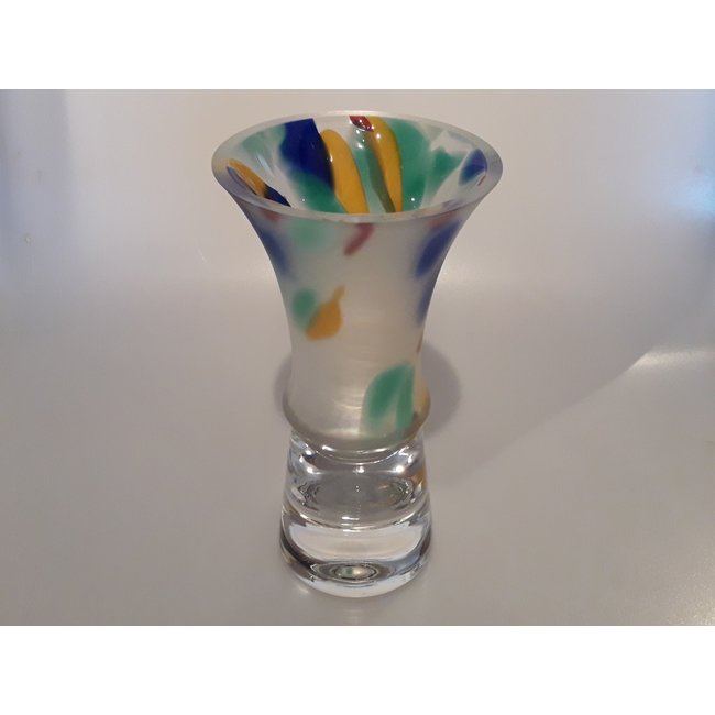 Dit mooie Leerdam Serica object Day by Day uit 1995 werd ontworpen door Menno Jonker en bestaat uit een massief glazen voet met daarop een mat-glazen kelk met meerdere kleuren erin verwerkt.