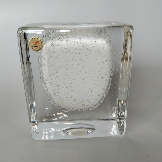 Prachtig glasobject van Royal Leerdam - ontworpen door Floris Meydam - welke de vorm heeft van een blokvaas. Het personeel van Glasfabriek Leerdam dat met pensioen ging, ontving dit object als afscheidsgeschenk.
