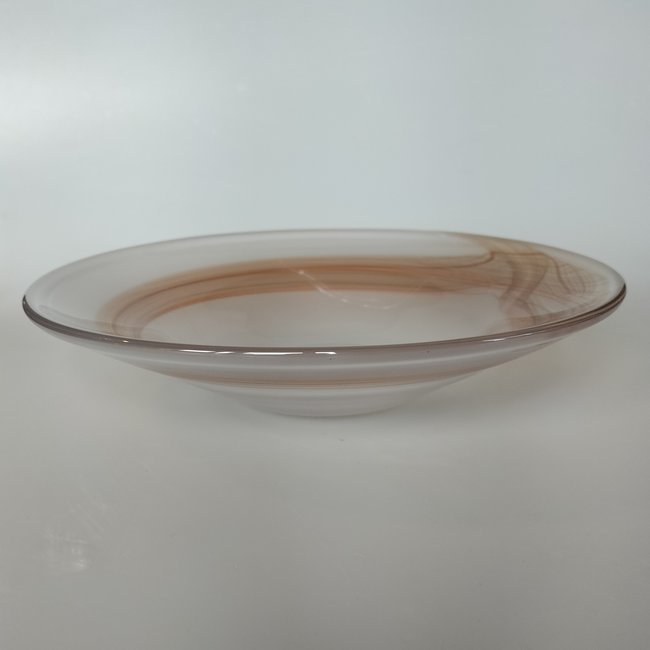 Uiterst fraaie glazen schaal van Floris Meydam, mondgeblazen door de glasblazers van Royal Leerdam Crystal. De glazen schaal is geblazen uit transparant/wit kristal, waarbij de schaal langs de buitenkant is voorzien van een mooi roodbruin lijnenpatroon in verschillende tinten. Daarnaast zijn er een aantal witte lijnen aangebracht, die van de rand naar de bodem lopen.