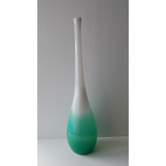 Schitterende Leerdam flesvaas in Opaalwit/Mintgroen, mondgeblazen in de Glasfabriek Leerdam. De fles is ontworpen door Floris Meydam in het jaar 1953.