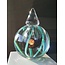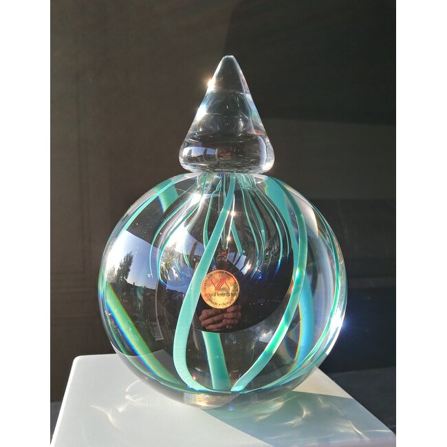 Deze Leerdam Serica werd in 1998 geblazen in de Leerdamse glasblazerij van Royal Leerdam Crystal, naar ontwerp van Siem van der Marel. De kristallen bol bevat een mooie blauwe kern, turquoise lijnen en heeft een afneembare stop, genaamd´een vleugje Friesland´.